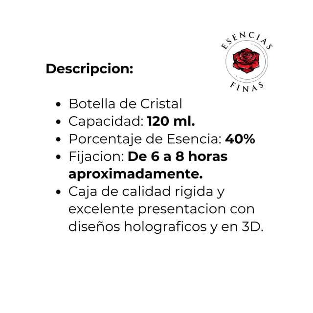 Las fragancias disponibles han sido cuidadosamente seleccionadas por su calidad y durabilidad, proporcionando una experiencia olfativa excepcional. Además, encontrarás opciones en presentaciones prácticas como sprays o roll-ons, perfectas para llevar contigo a cualquier lugar. Añade un toque final a tu rutina con nuestras fragancias distintivas.